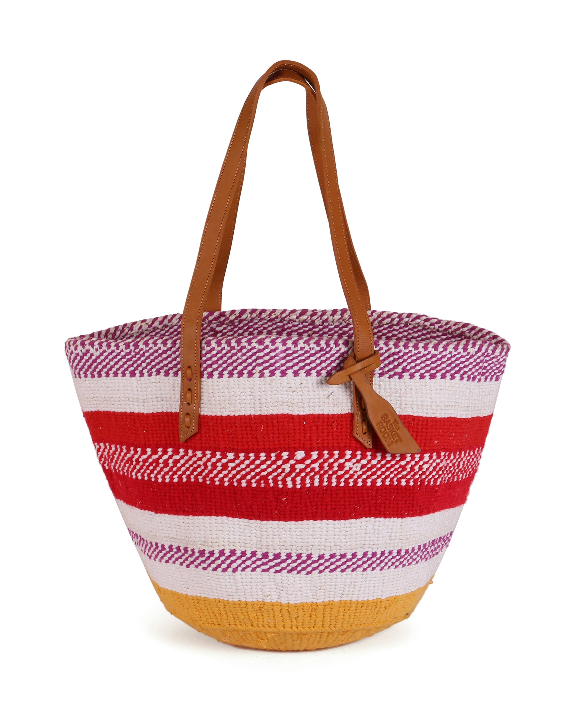 Introducing TAULO: a one-off woollen basket bag handwoven by the Kamba tribe in Kenya. Bolts of bright Red, White & Pink pop against a natural base, creating a distinctly tribal effect.