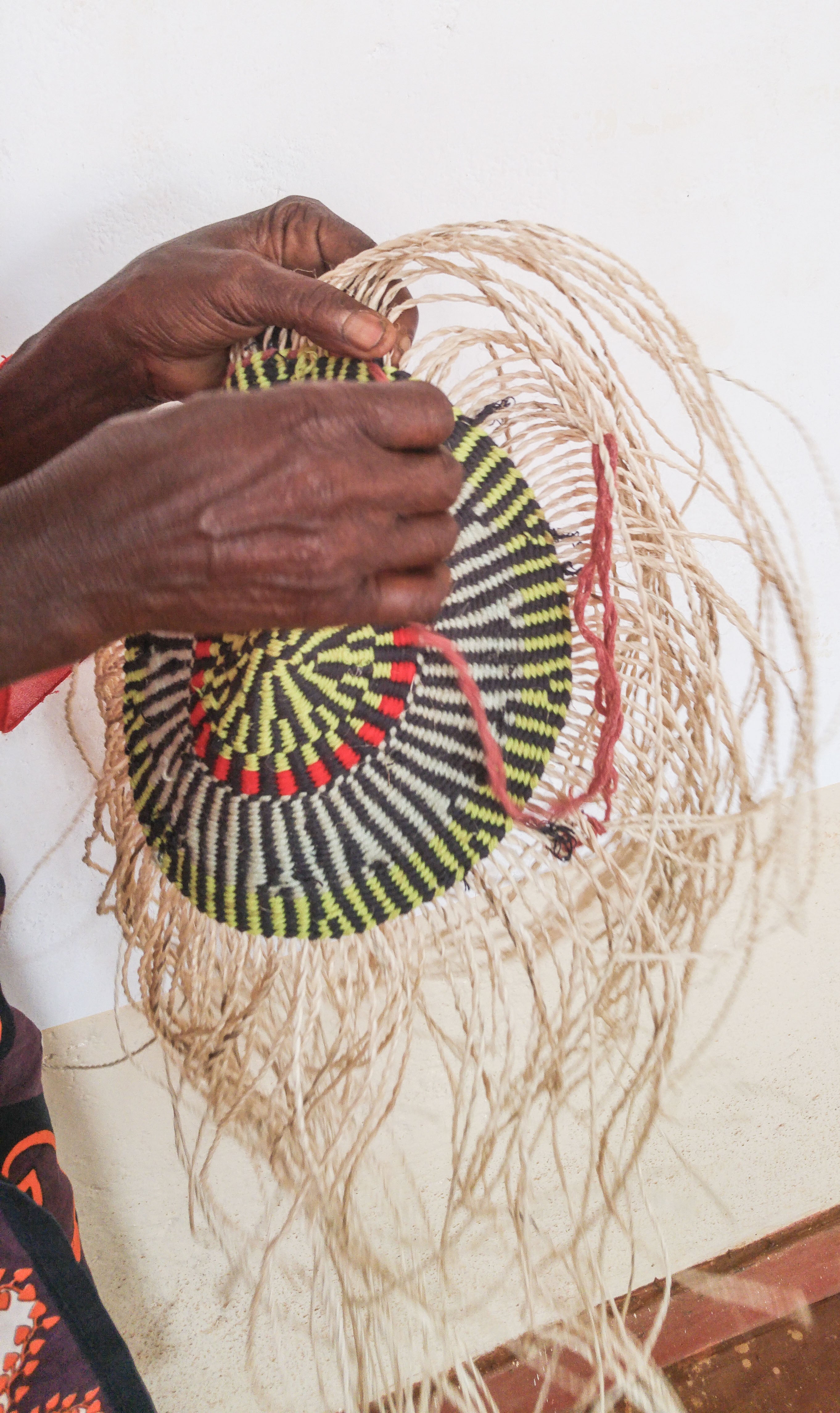 To transform the woven baskets into our colourful tote bags, bucket bags and backpacks, the baskets are taken to a local tannery where cow hide straps are produced and attached by talented leatherworkers.