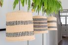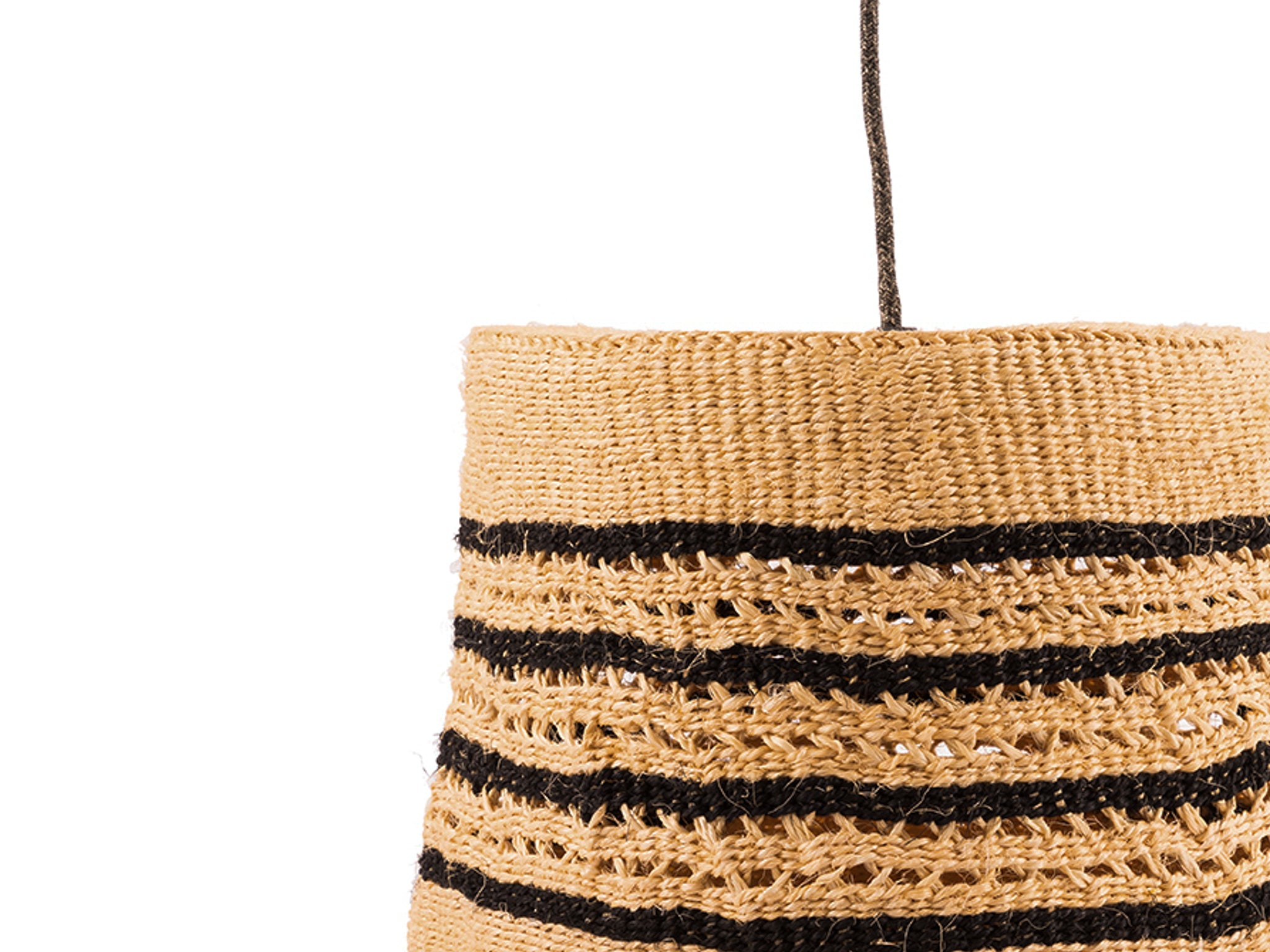 Mit vier schwarzen Streifen auf einer natürlichen Basis und einem teilweise offenen Webdesign verleiht der PITIA-Lampenschirm jedem Raum einen Hauch von ethischem Stil und erzeugt ein wunderbar weiches Licht.