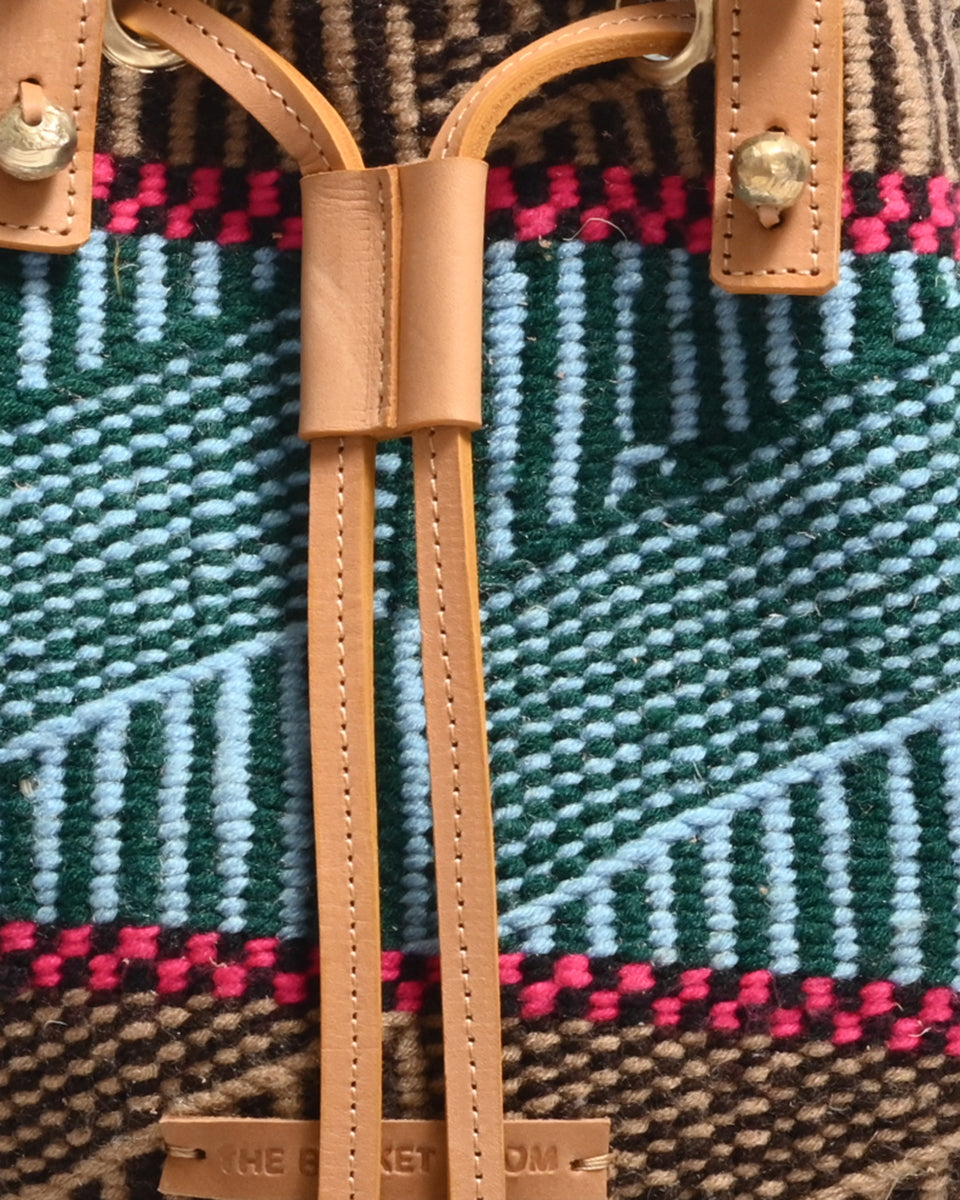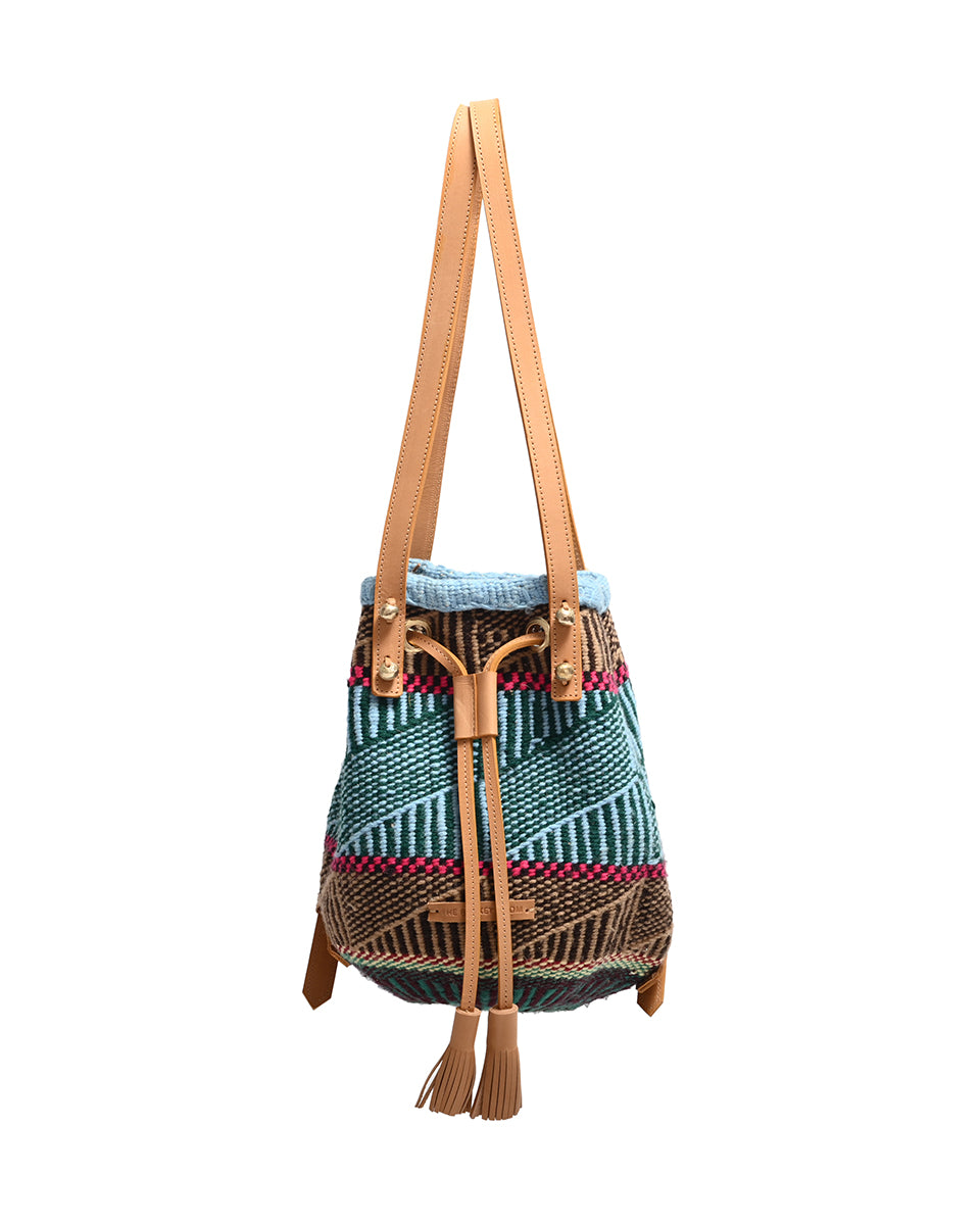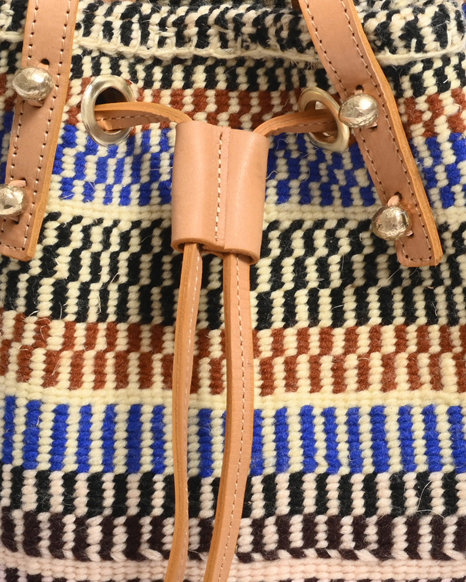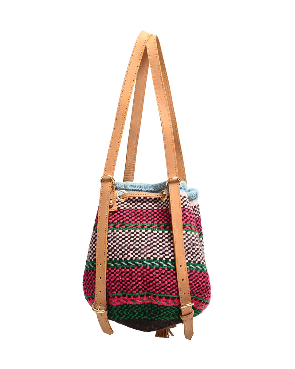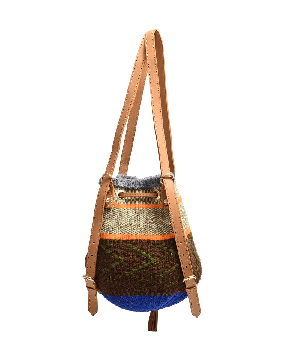 Sac d'été ultime et accessoire de festival parfait, nos sacs seau et sacs à dos tissés colorés sont tissés à la main dans des motifs tribaux uniques par des femmes travaillant au sein d'une coopérative de tissage au Kenya. Durables de bout en bout, les rivets en perles métalliques sont fabriqués à partir de laiton recyclé et coulé au sable par des artisans vivant dans le bidonville de Kawangware à Nairobi.