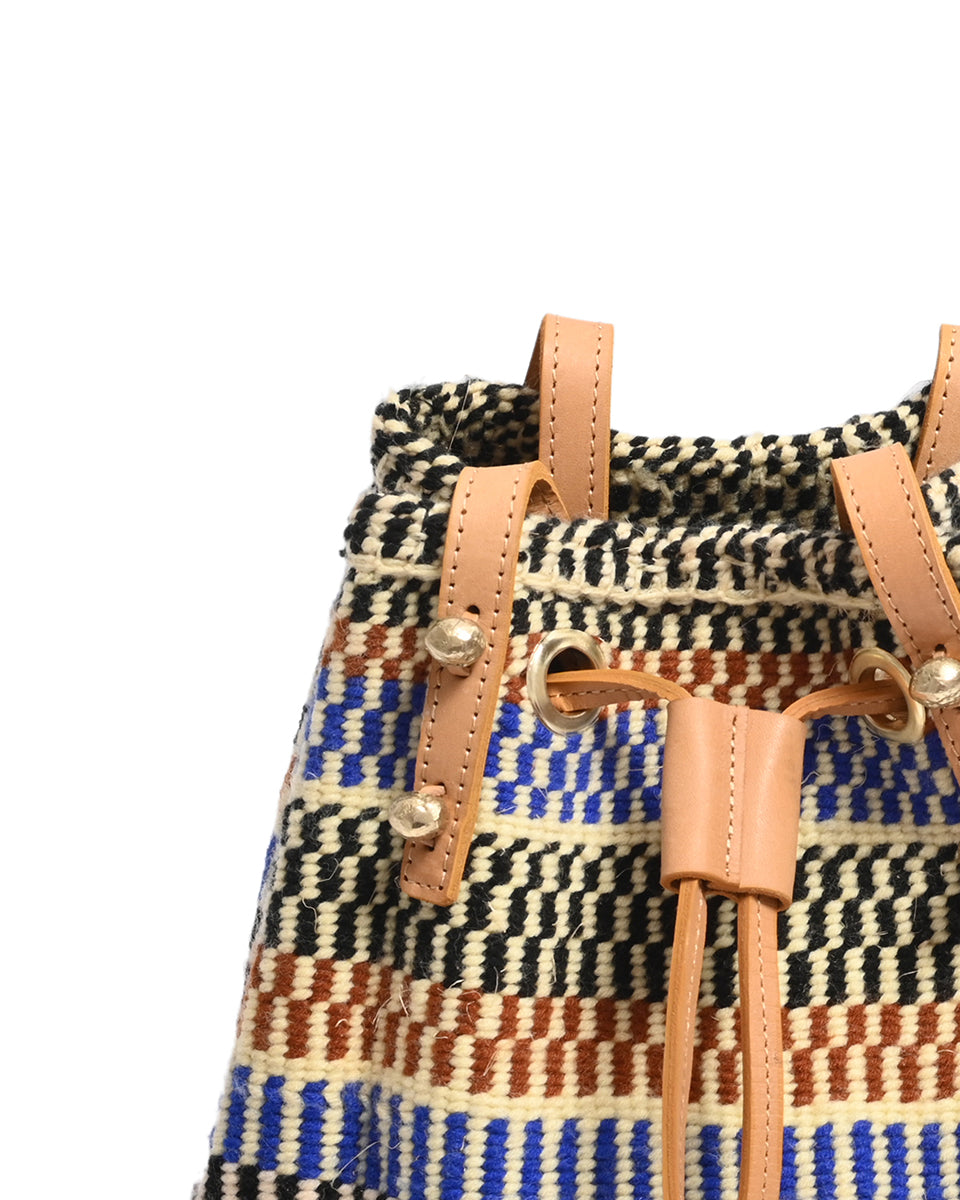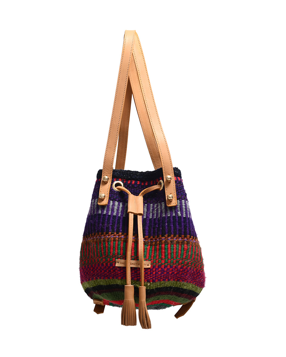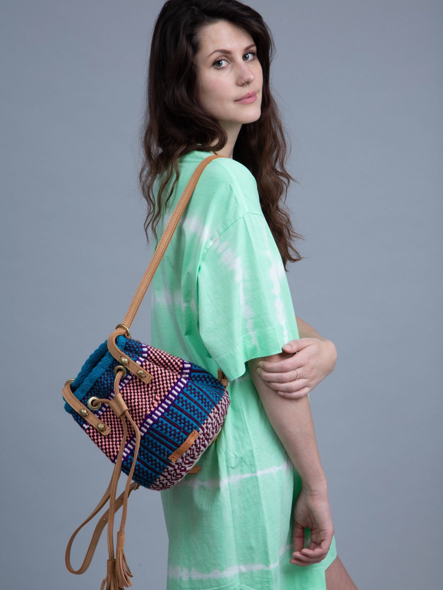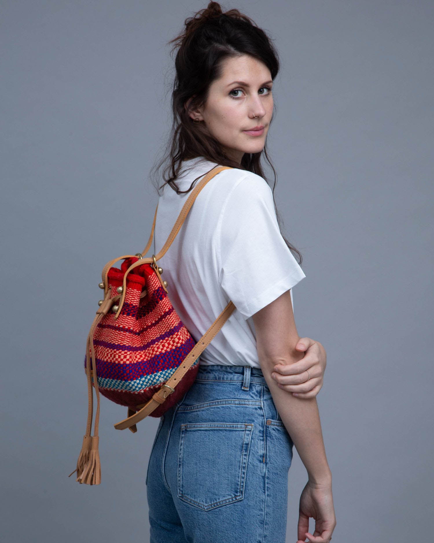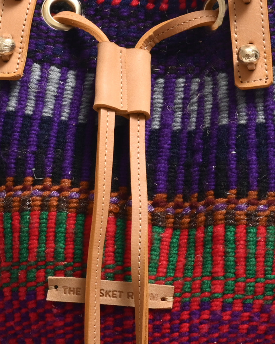 Sac d'été ultime et accessoire de festival parfait, nos sacs seau et sacs à dos tissés colorés sont tissés à la main dans des motifs tribaux uniques par des femmes travaillant au sein d'une coopérative de tissage au Kenya. Durables de bout en bout, les rivets en perles métalliques sont fabriqués à partir de laiton recyclé et coulé au sable par des artisans vivant dans le bidonville de Kawangware à Nairobi.