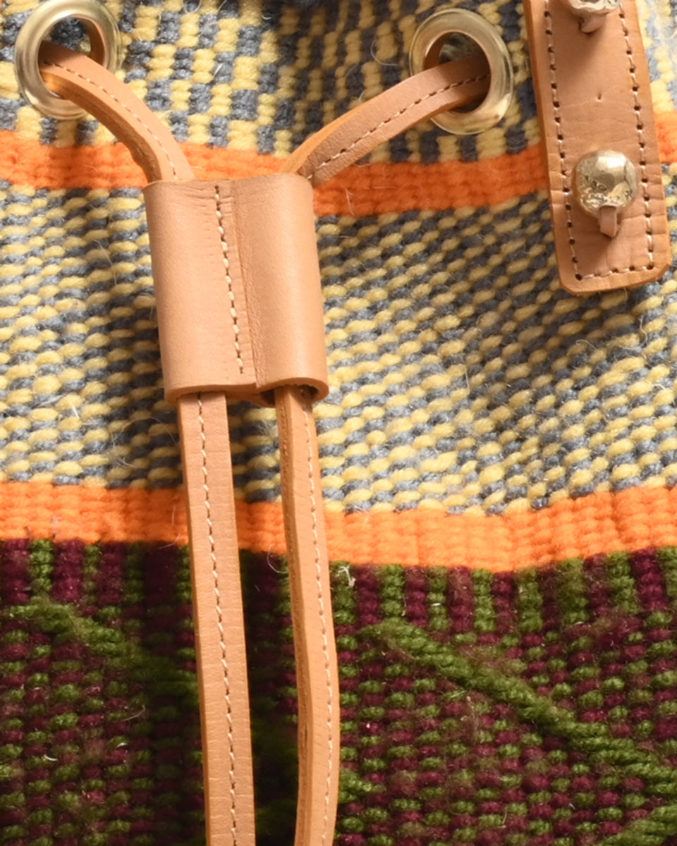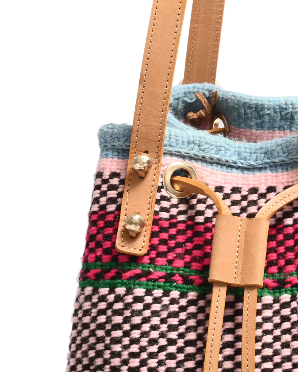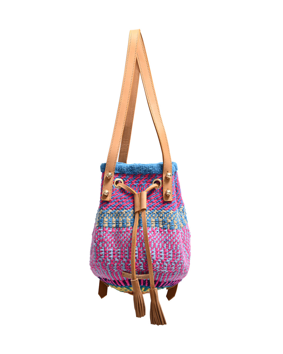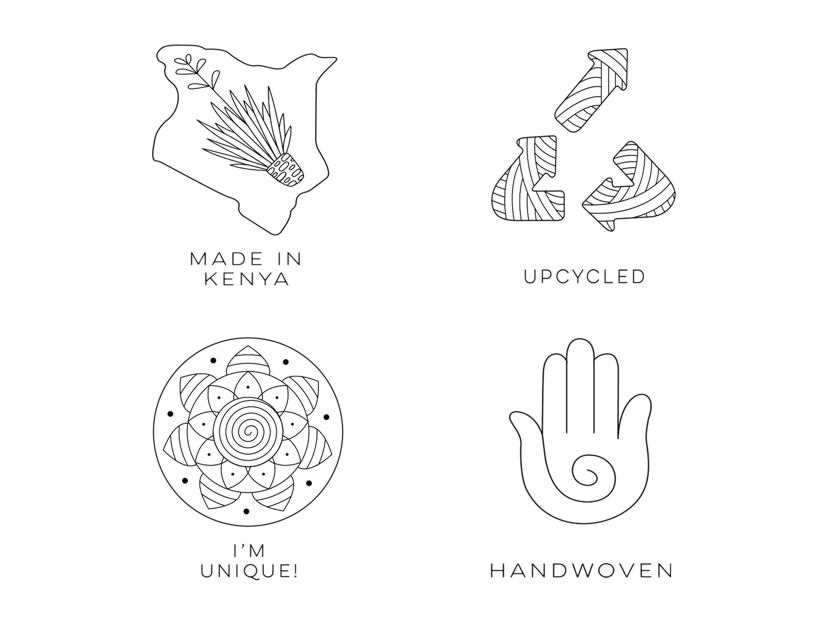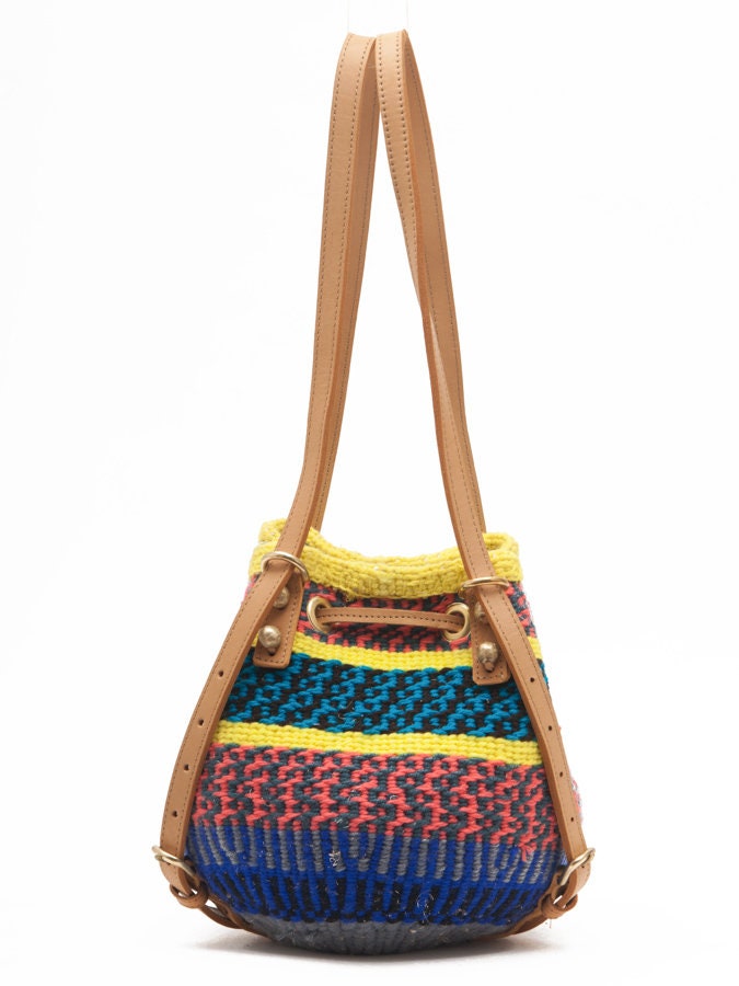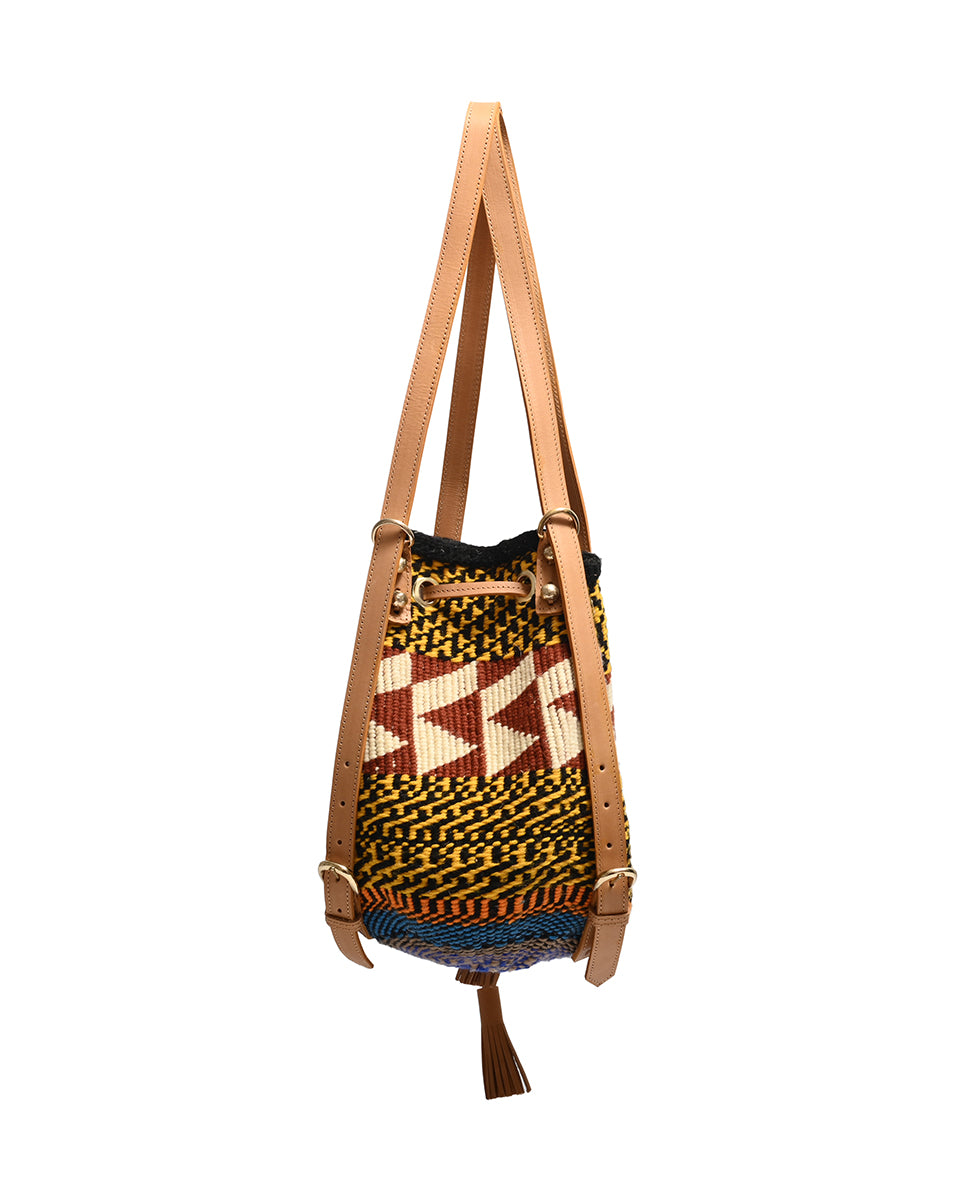 Sac d'été ultime et accessoire de festival parfait, nos sacs seau et sacs à dos tissés colorés sont tissés à la main dans des motifs tribaux uniques par des femmes travaillant au sein d'une coopérative de tissage au Kenya. Durables de bout en bout, les rivets en perles métalliques sont fabriqués à partir de laiton recyclé et coulé au sable par des artisans vivant dans le bidonville de Kawangware à Nairobi.