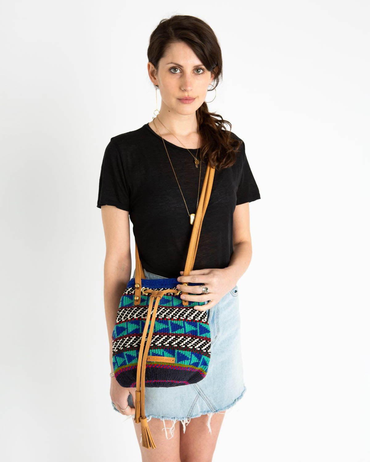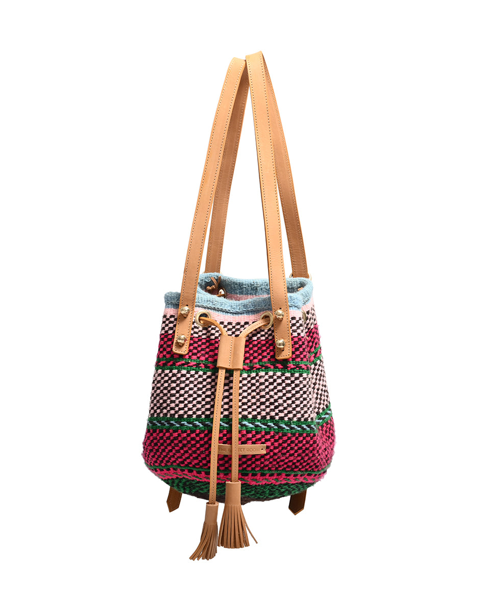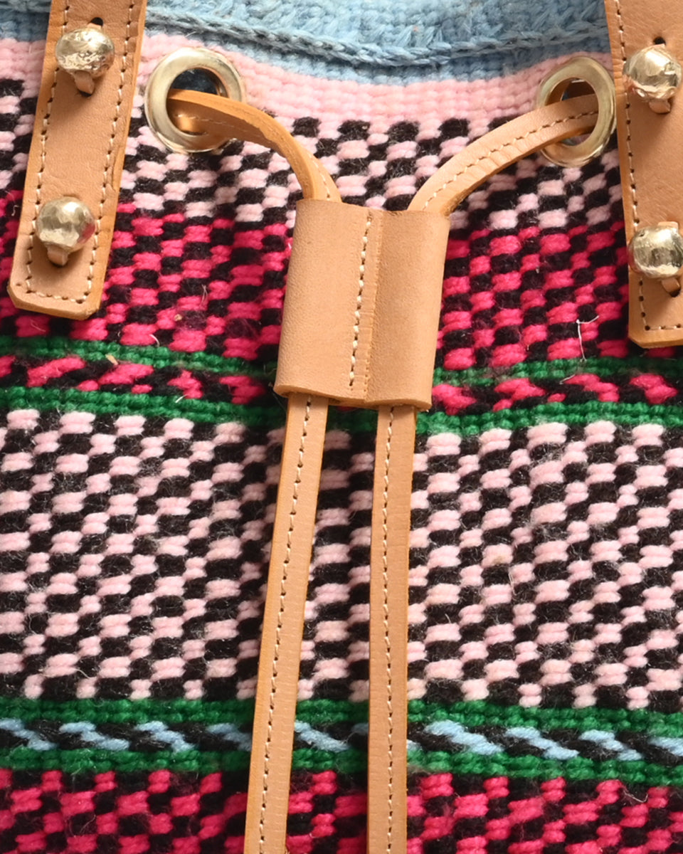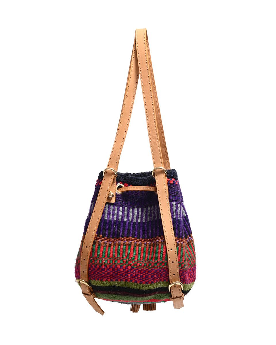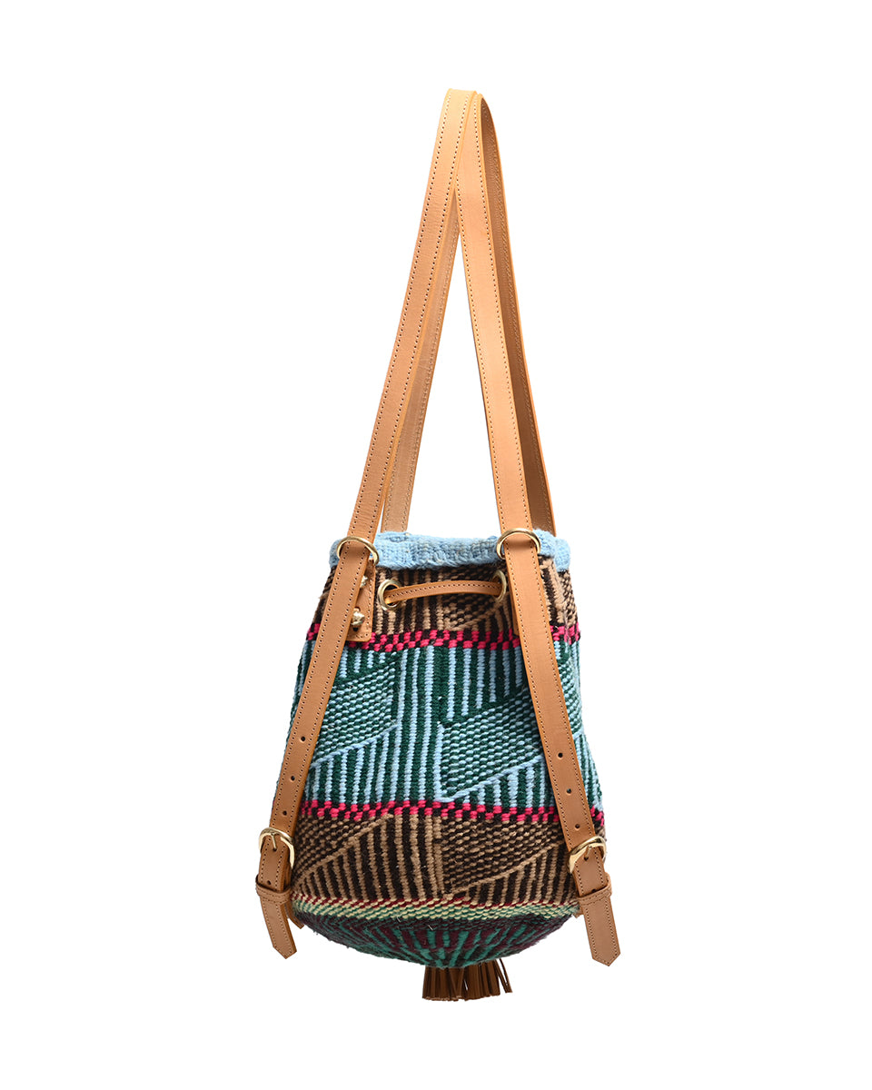 Sac d'été ultime et accessoire de festival parfait, nos sacs seau et sacs à dos tissés colorés sont tissés à la main dans des motifs tribaux uniques par des femmes travaillant au sein d'une coopérative de tissage au Kenya. Durables de bout en bout, les rivets en perles métalliques sont fabriqués à partir de laiton recyclé et coulé au sable par des artisans vivant dans le bidonville de Kawangware à Nairobi.