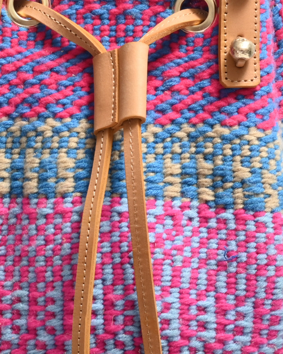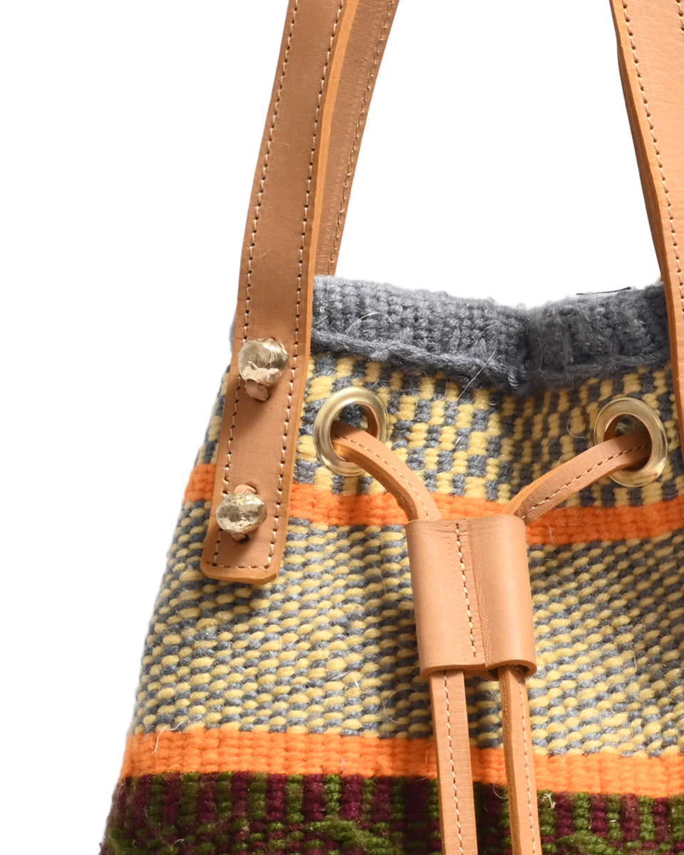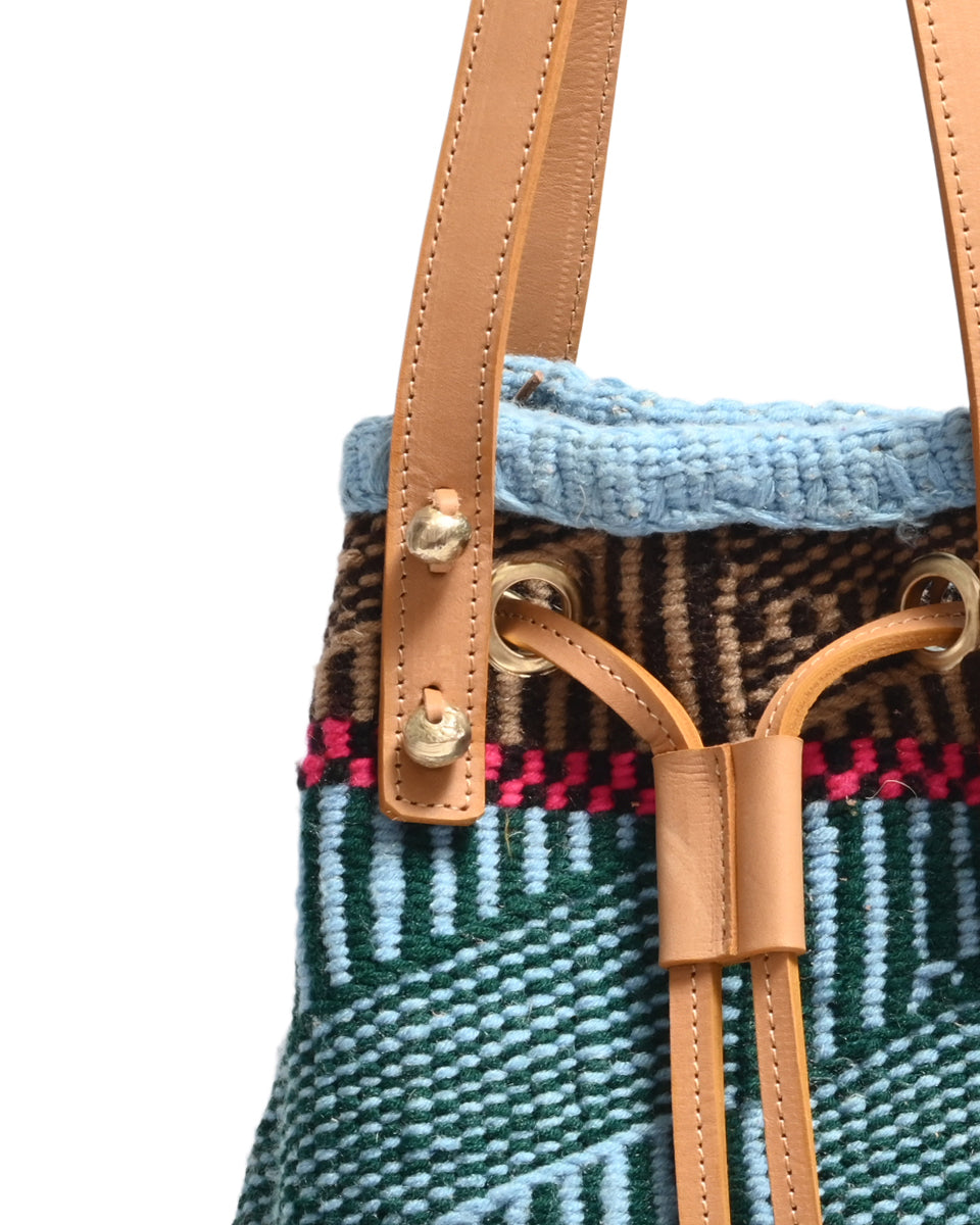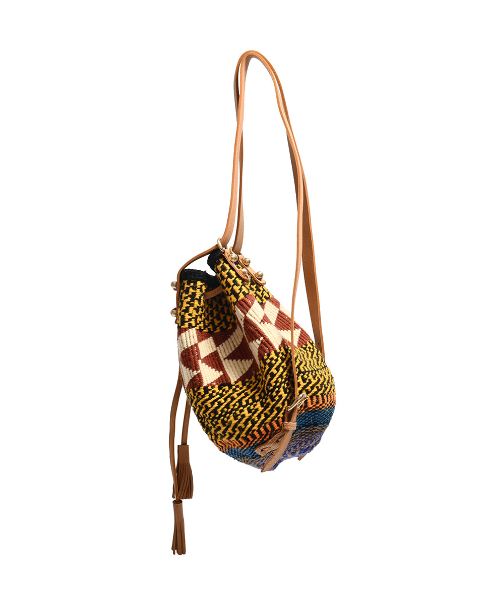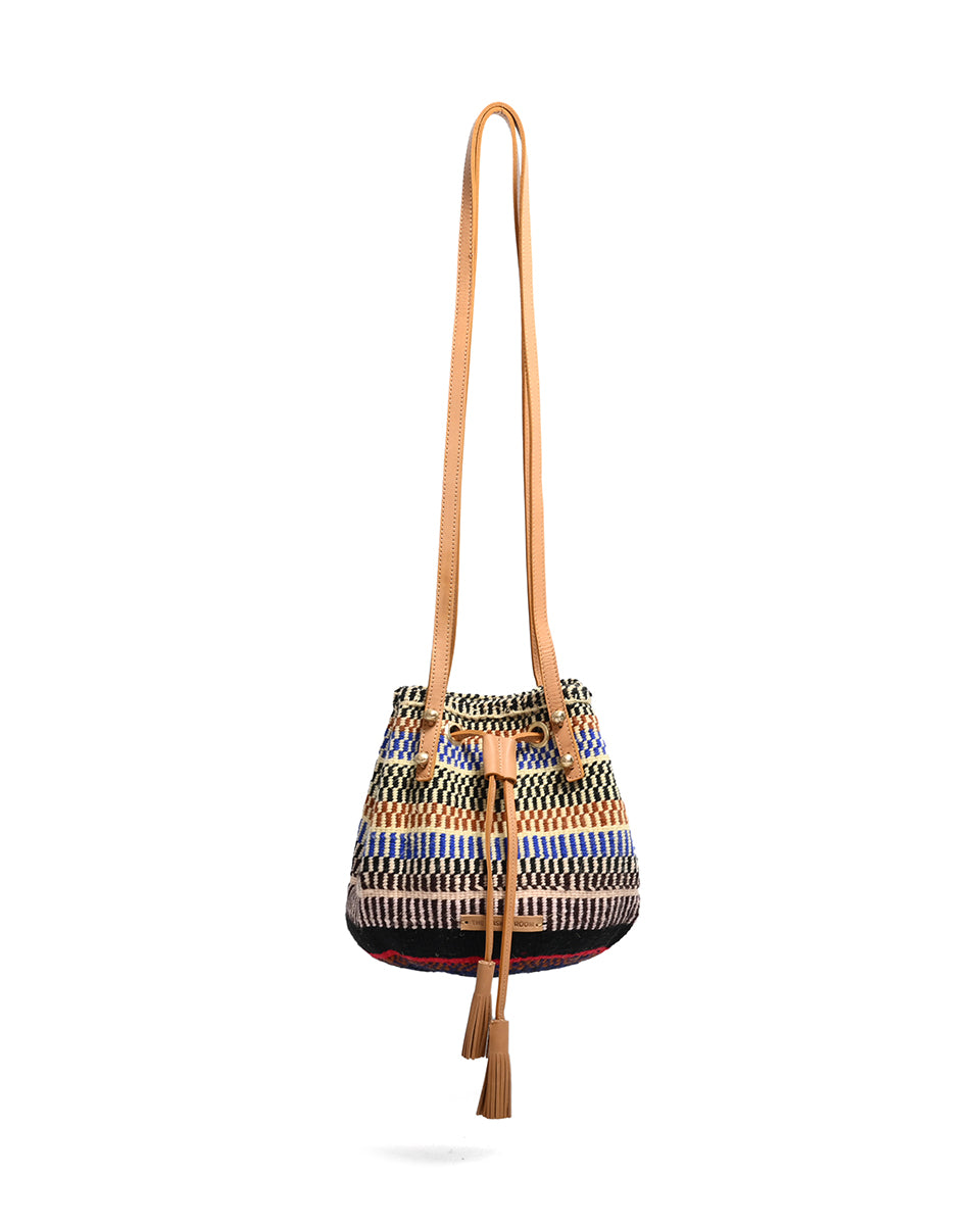 Sac d'été ultime et accessoire de festival parfait, nos sacs seau et sacs à dos tissés colorés sont tissés à la main dans des motifs tribaux uniques par des femmes travaillant au sein d'une coopérative de tissage au Kenya. Durables de bout en bout, les rivets en perles métalliques sont fabriqués à partir de laiton recyclé et coulé au sable par des artisans vivant dans le bidonville de Kawangware à Nairobi.