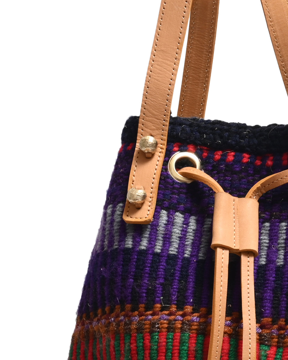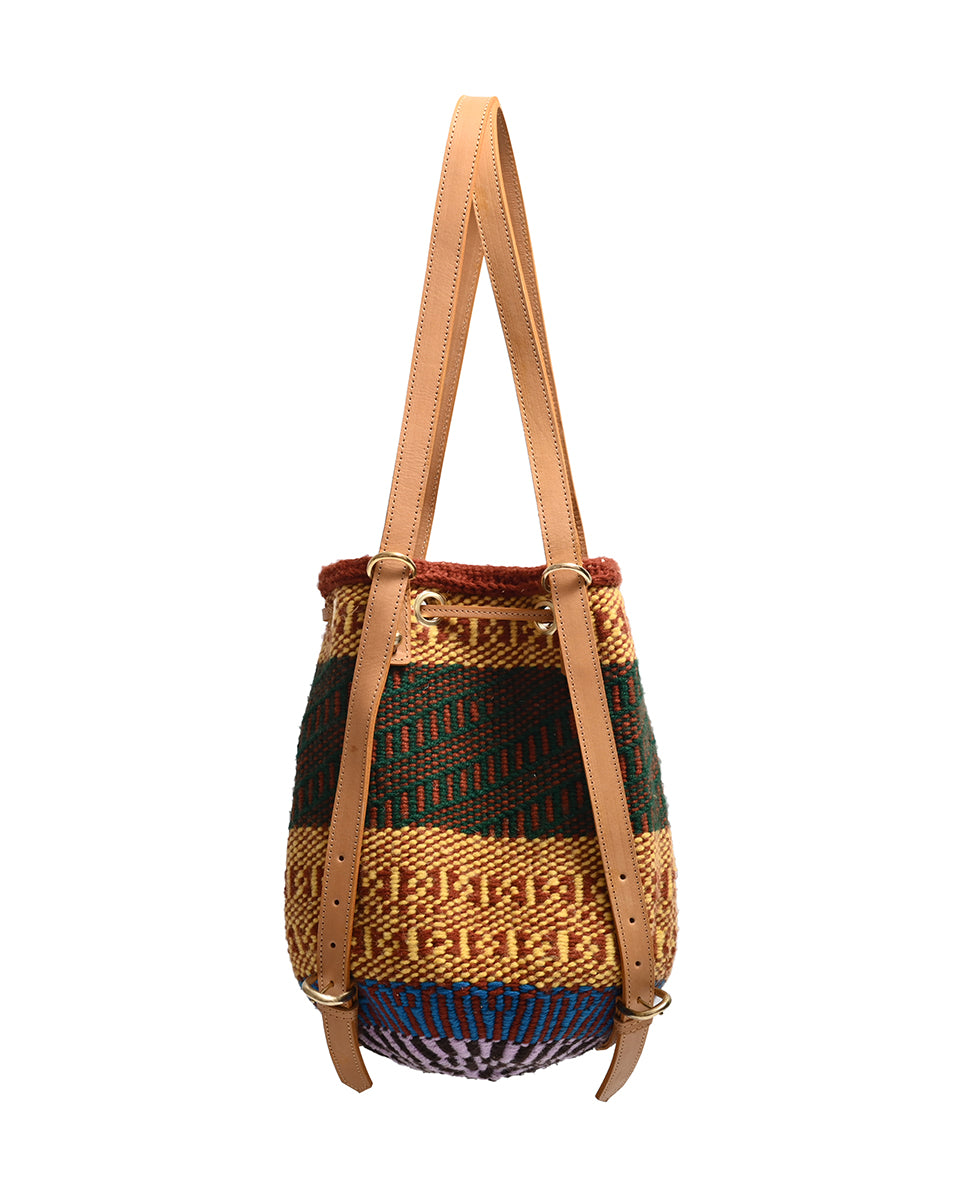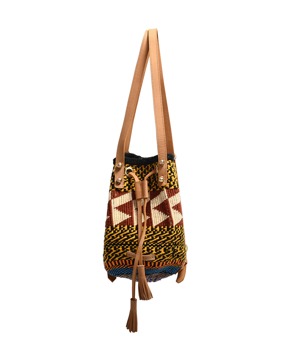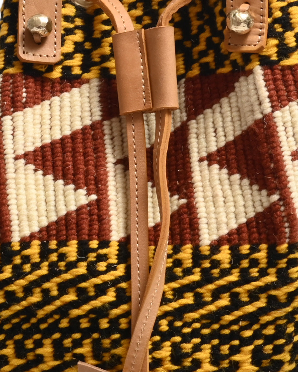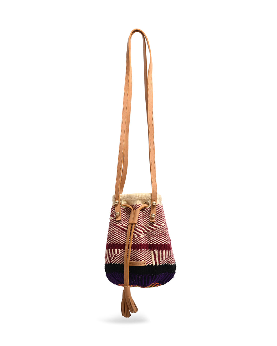 Sac d'été ultime et accessoire de festival parfait, nos sacs seau et sacs à dos tissés colorés sont tissés à la main dans des motifs tribaux uniques par des femmes travaillant au sein d'une coopérative de tissage au Kenya. Durables de bout en bout, les rivets en perles métalliques sont fabriqués à partir de laiton recyclé et coulé au sable par des artisans vivant dans le bidonville de Kawangware à Nairobi.