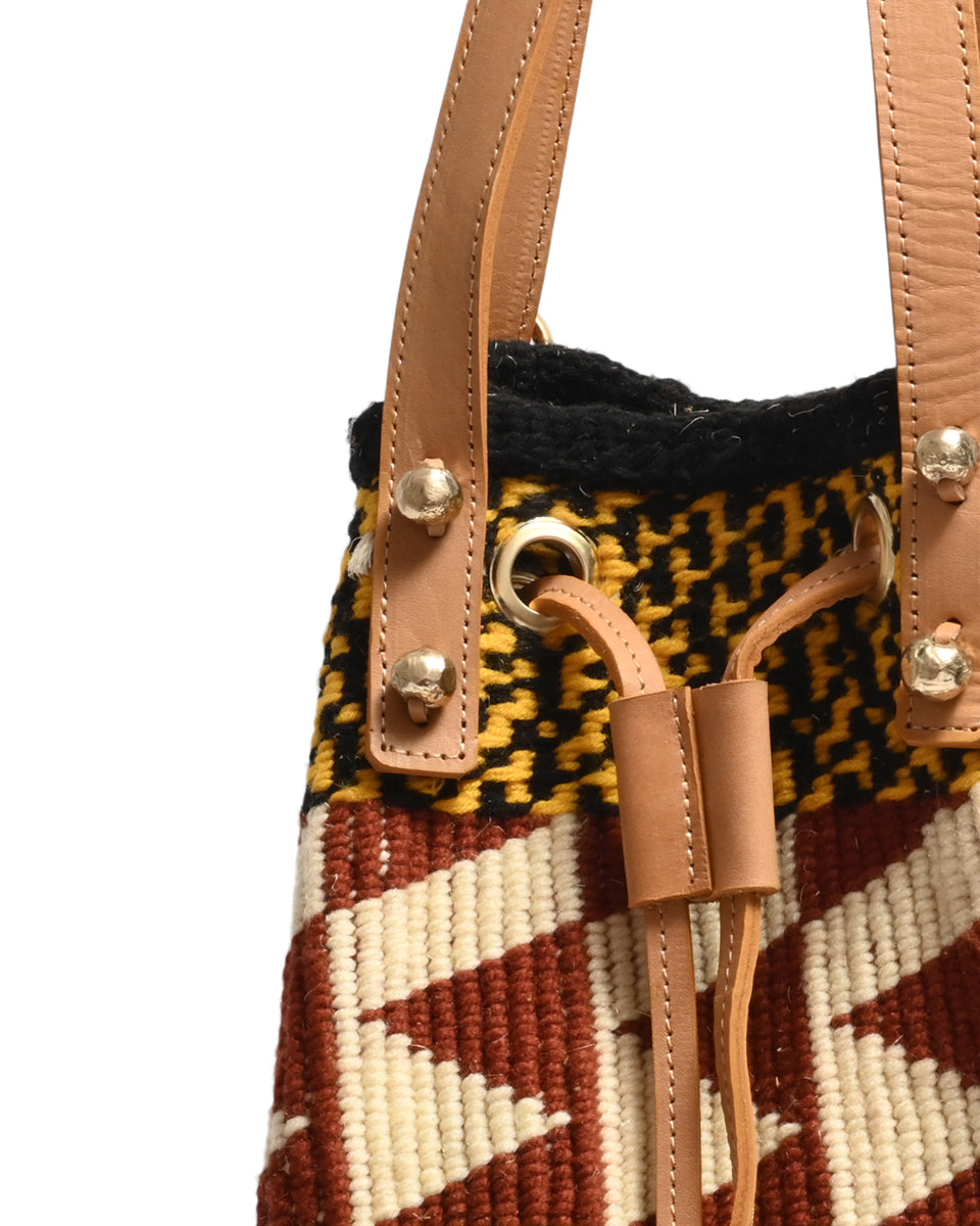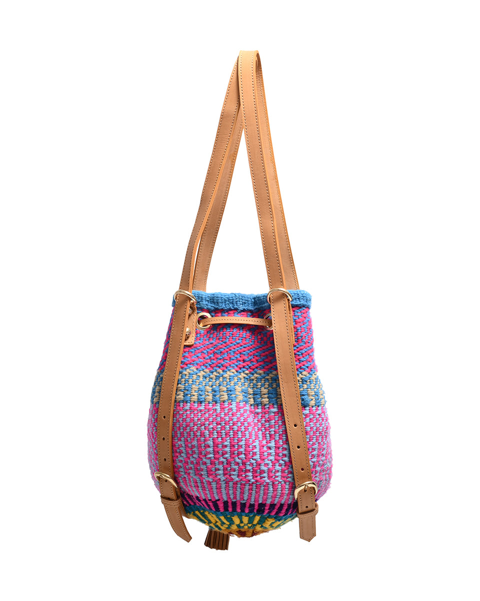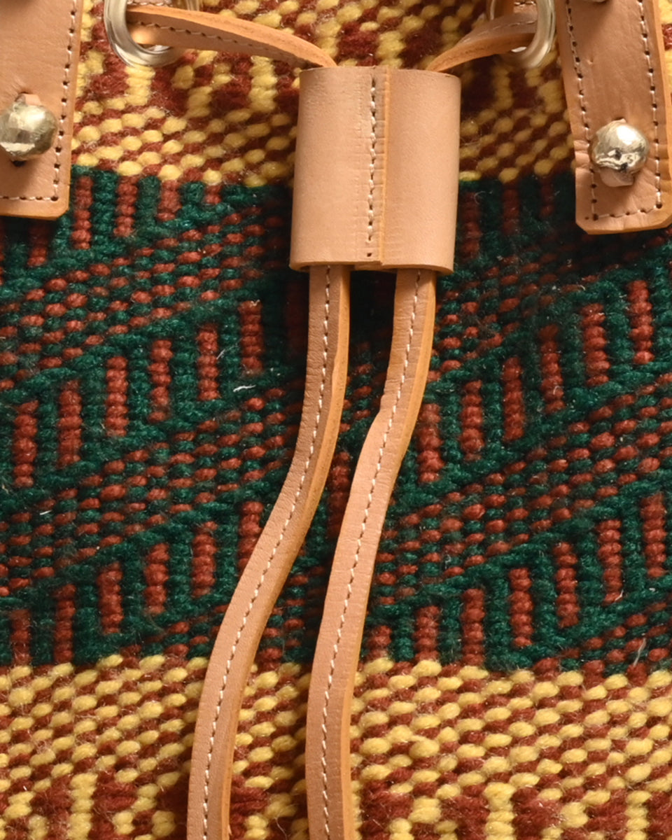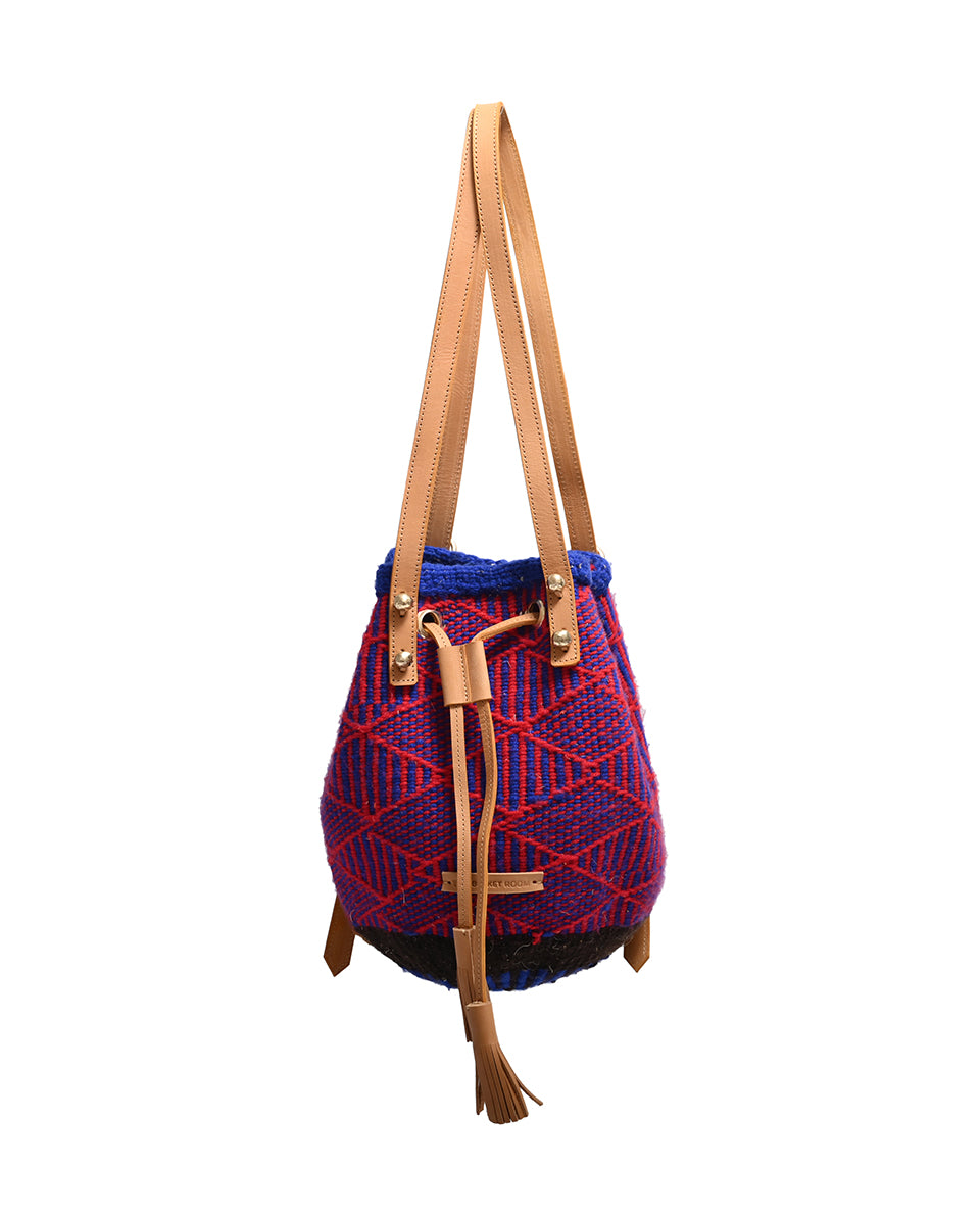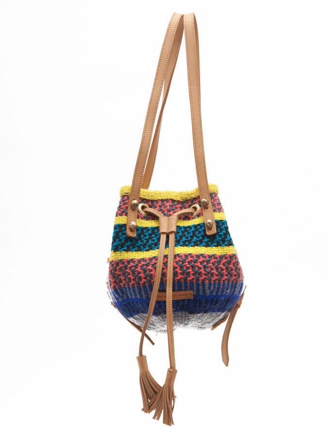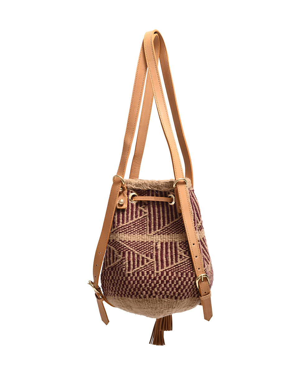 Sac d'été ultime et accessoire de festival parfait, nos sacs seau et sacs à dos tissés colorés sont tissés à la main dans des motifs tribaux uniques par des femmes travaillant au sein d'une coopérative de tissage au Kenya. Durables de bout en bout, les rivets en perles métalliques sont fabriqués à partir de laiton recyclé et coulé au sable par des artisans vivant dans le bidonville de Kawangware à Nairobi.