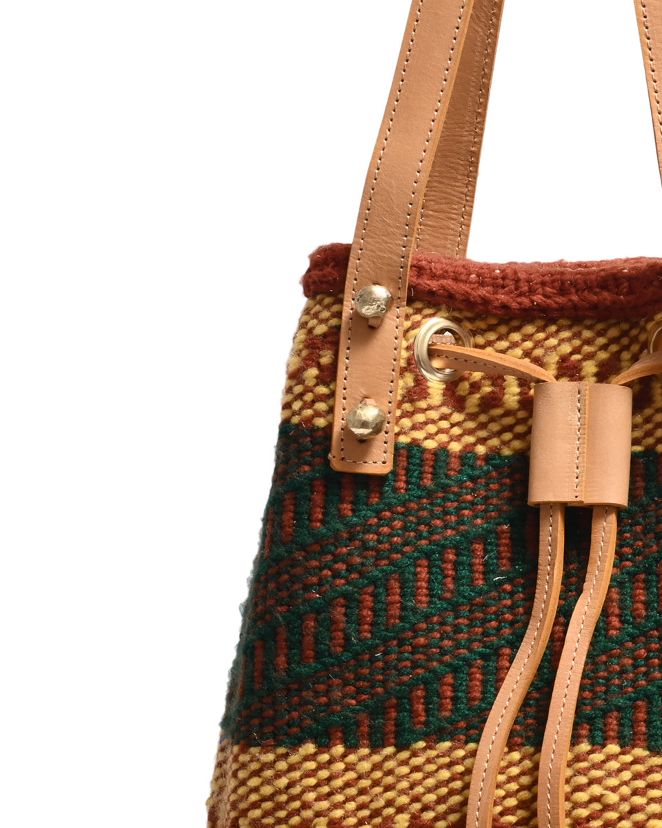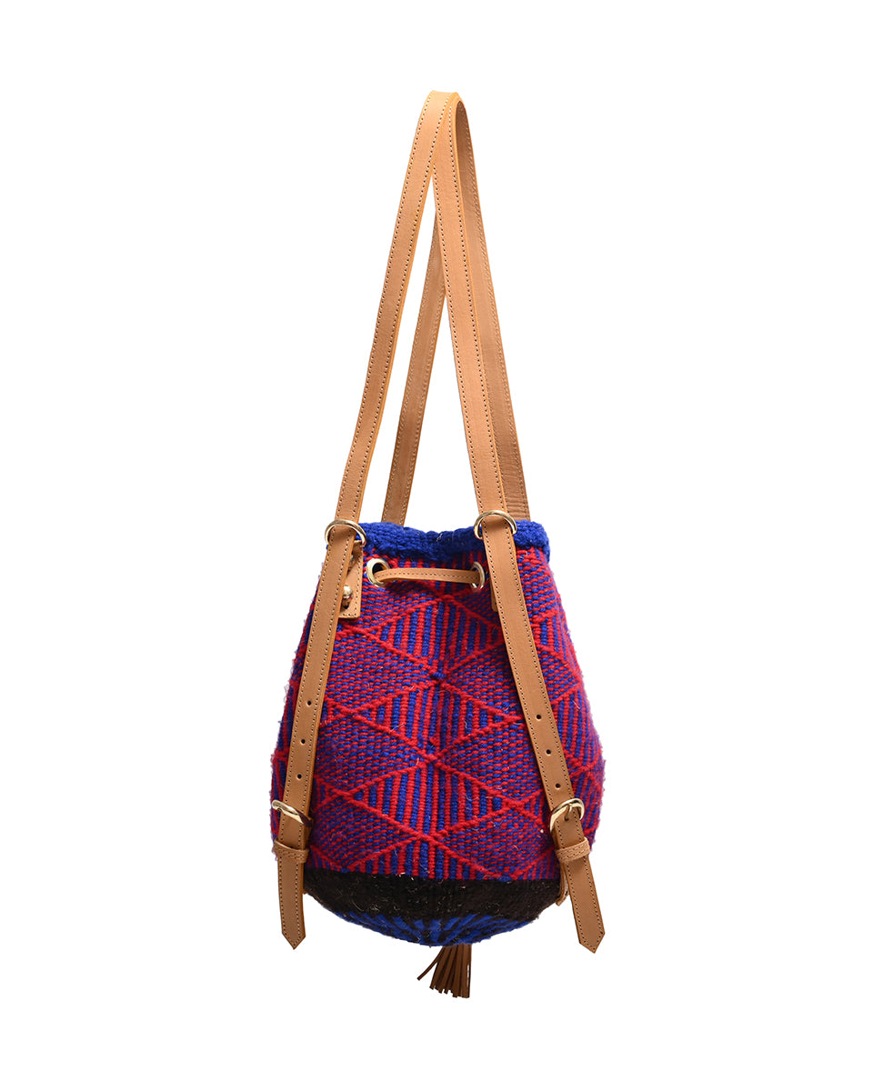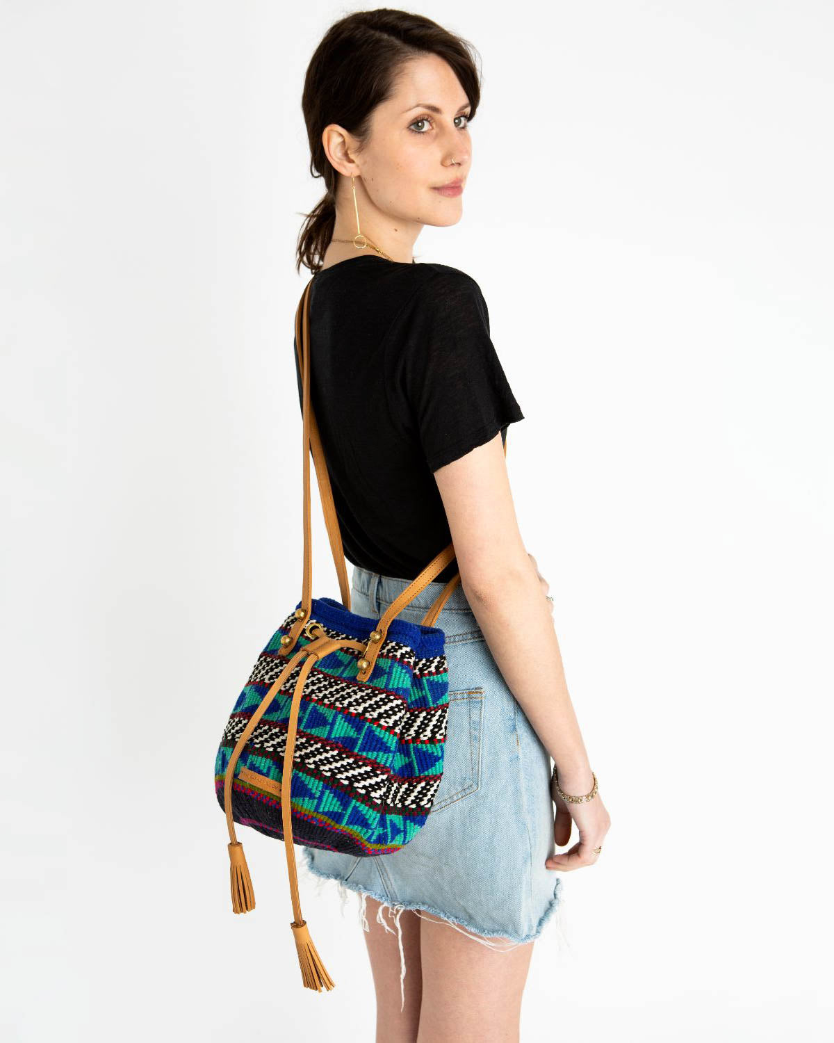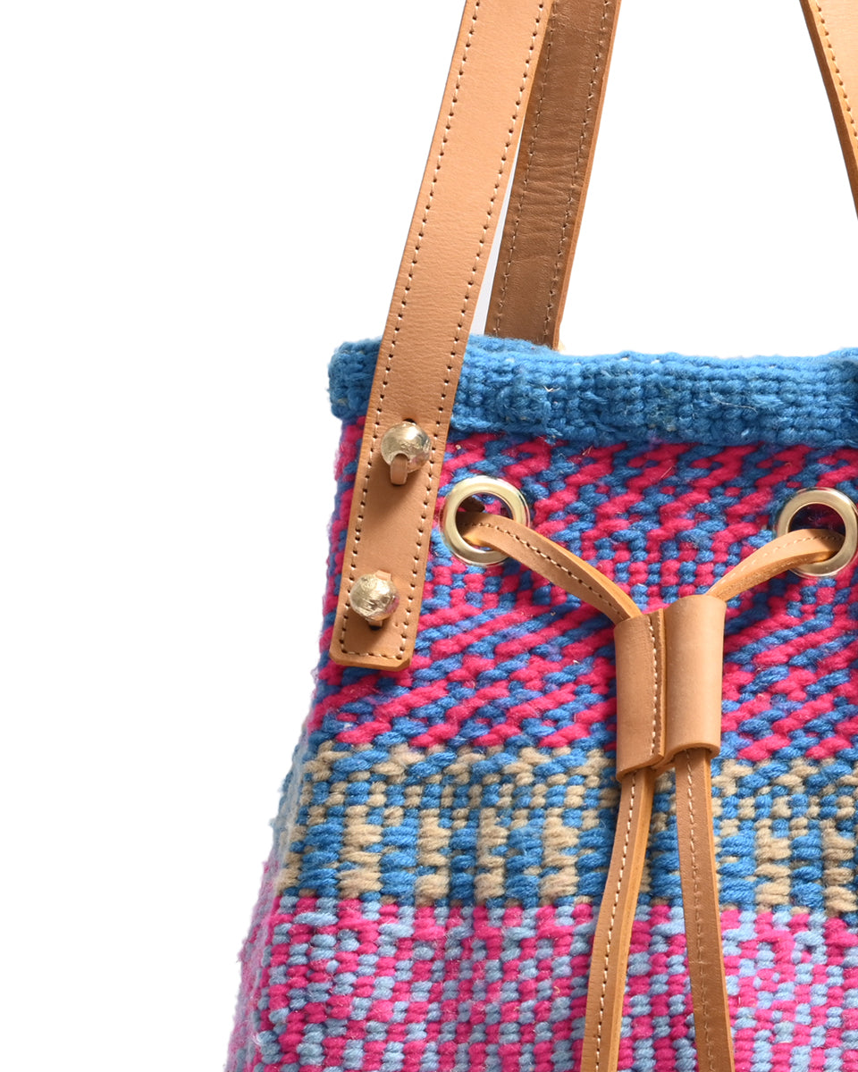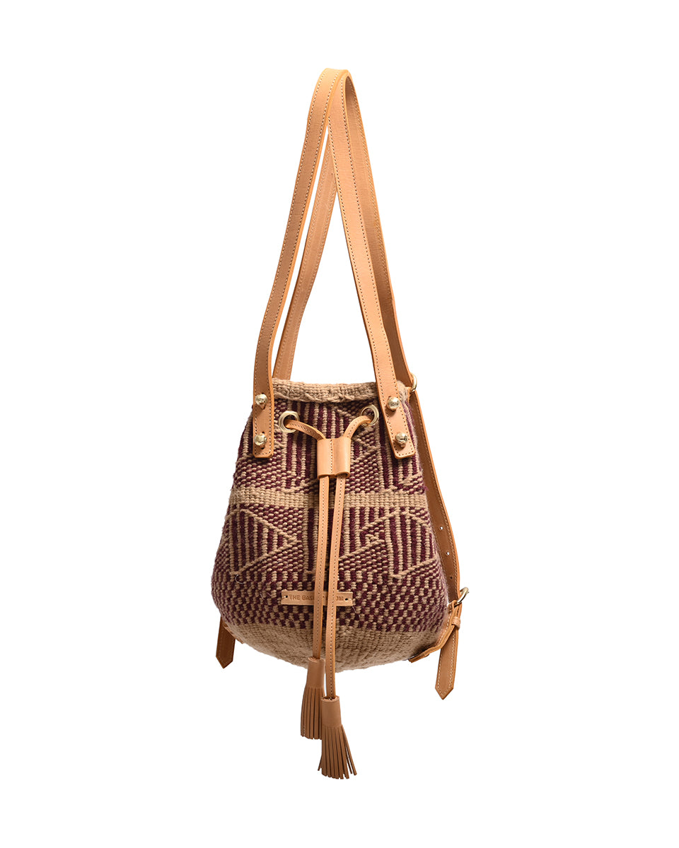 Sac d'été ultime et accessoire de festival parfait, nos sacs seau et sacs à dos tissés colorés sont tissés à la main dans des motifs tribaux uniques par des femmes travaillant au sein d'une coopérative de tissage au Kenya. Durables de bout en bout, les rivets en perles métalliques sont fabriqués à partir de laiton recyclé et coulé au sable par des artisans vivant dans le bidonville de Kawangware à Nairobi.