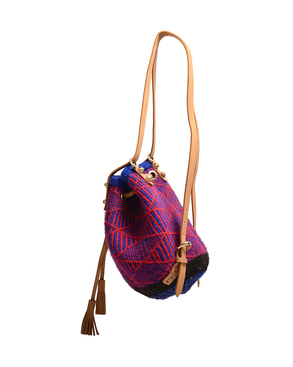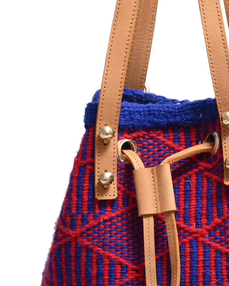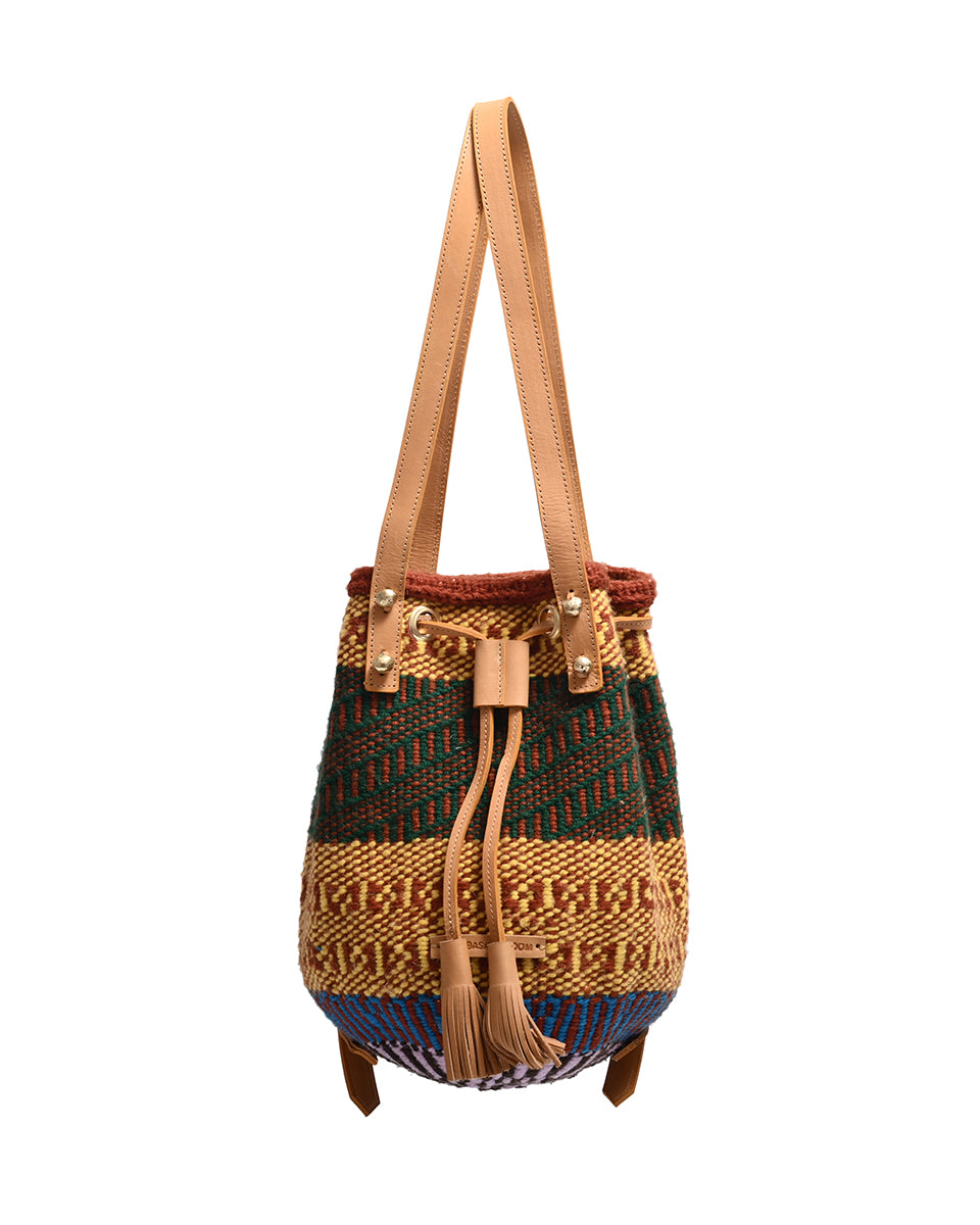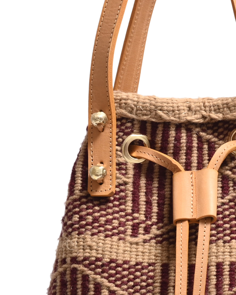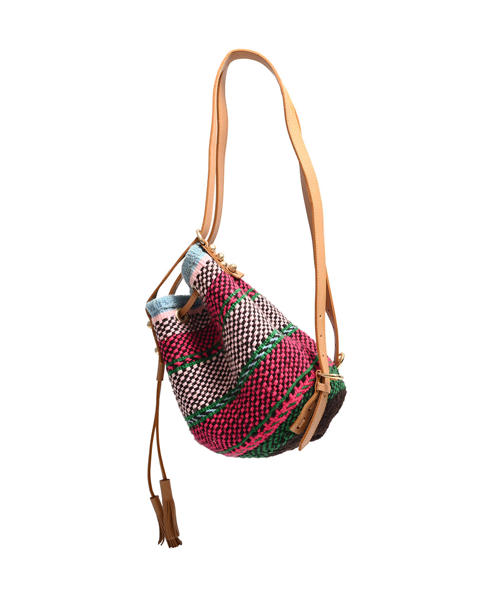 Sac d'été ultime et accessoire de festival parfait, nos sacs seau et sacs à dos tissés colorés sont tissés à la main dans des motifs tribaux uniques par des femmes travaillant au sein d'une coopérative de tissage au Kenya. Durables de bout en bout, les rivets en perles métalliques sont fabriqués à partir de laiton recyclé et coulé au sable par des artisans vivant dans le bidonville de Kawangware à Nairobi.