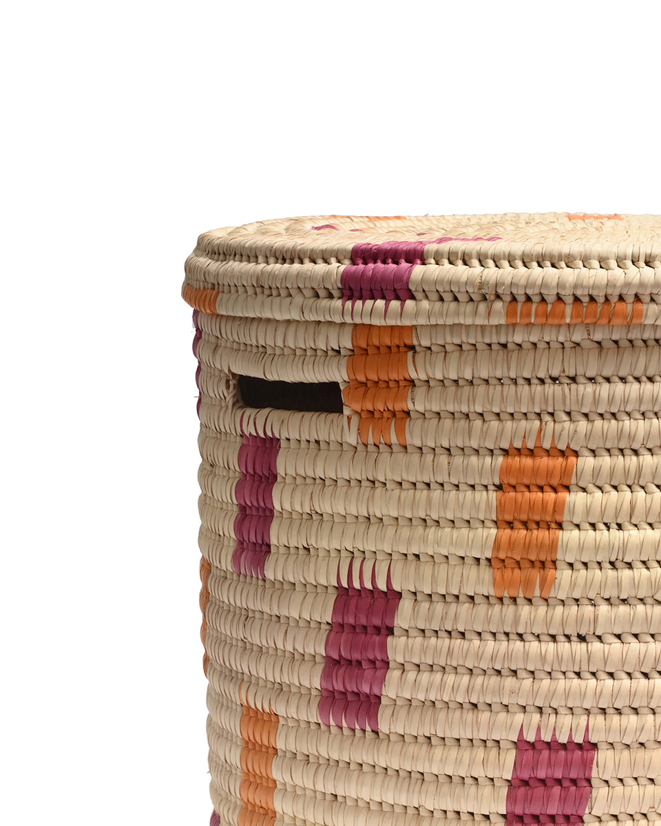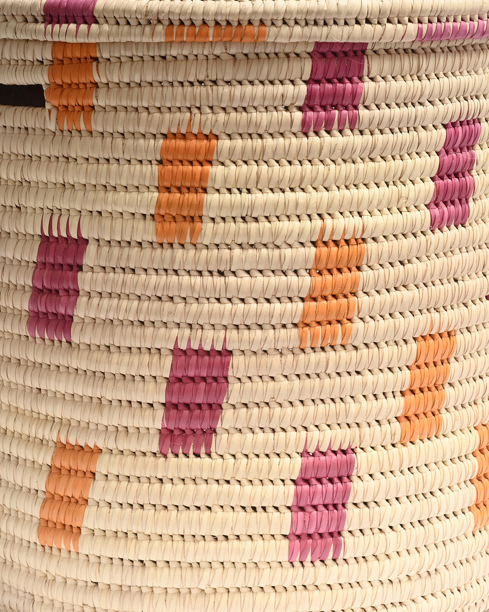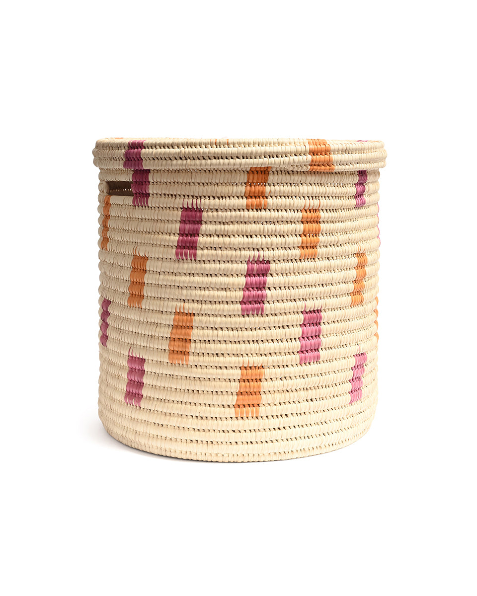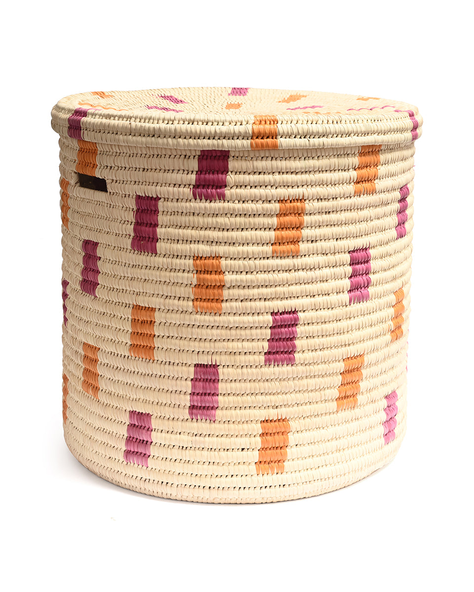 We believe in adding a touch of joy to every day, and our MADOADOA lidded African laundry basket certainly delivers. With a colourful pink and orange brushstroke woven design on a cream background, this handwoven laundry hamper comes in three sizes, making it easy to sort and store your washing.