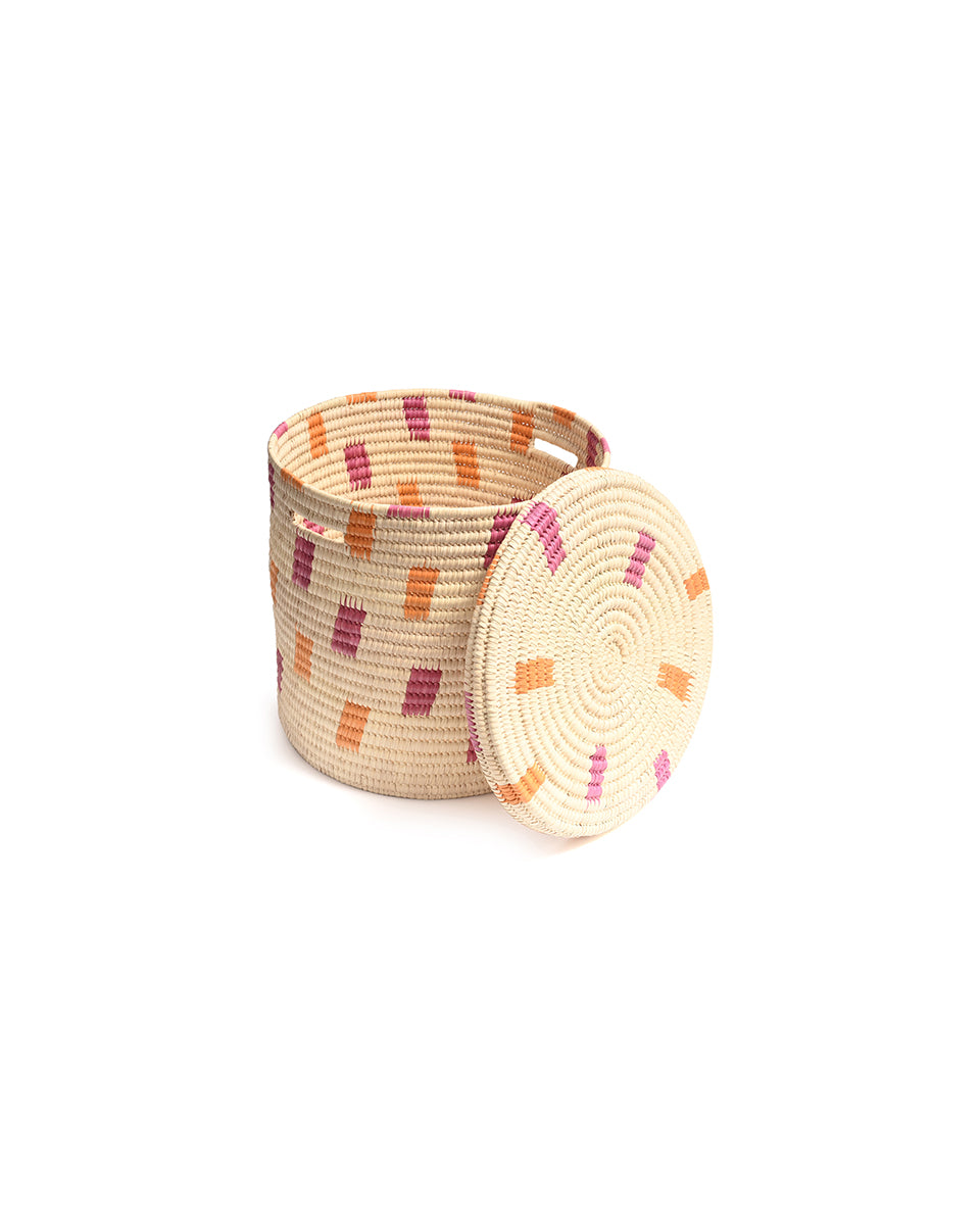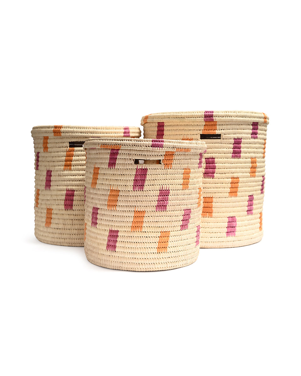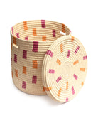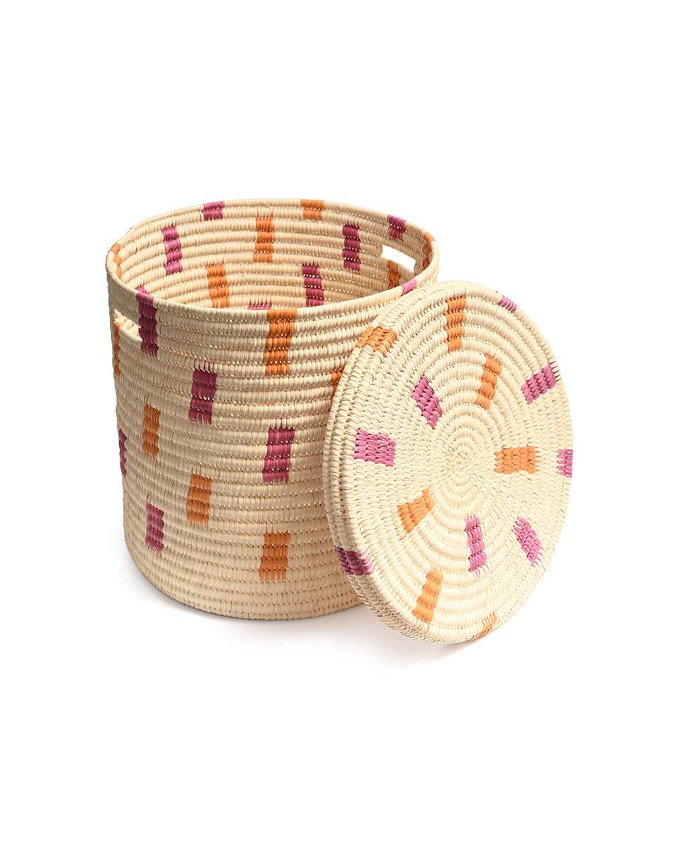 We believe in adding a touch of joy to every day, and our MADOADOA lidded African laundry basket certainly delivers. With a colourful pink and orange brushstroke woven design on a cream background, this handwoven laundry hamper comes in three sizes, making it easy to sort and store your washing.