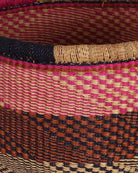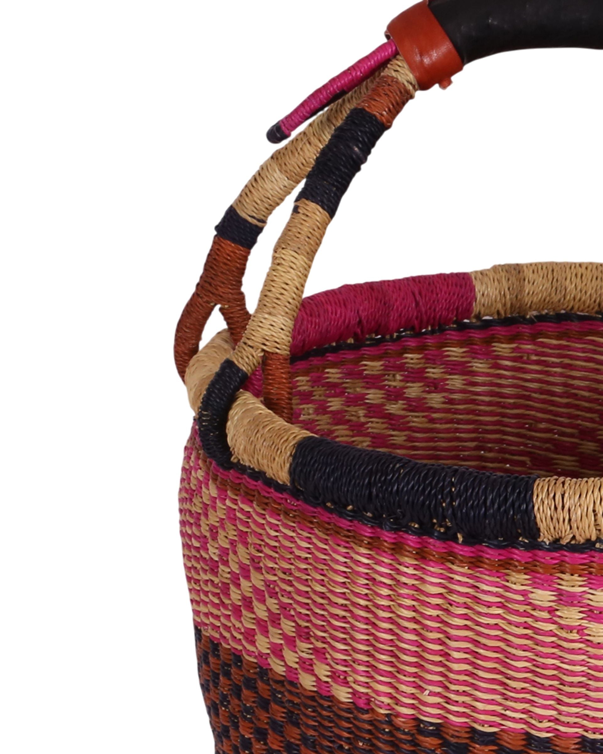 ATALFIM is a hand woven market basket produced in the traditional Ghanaian bolga basket style. With tribal patterns in Pink, Brown & Black this basket is perfect for market trips or picnics, but can also be put to use all over the home – as a laundry basket, toy basket, vegetable basket, blanket basket – the possibilities are endless! Every market basket in this collection is totally unique – made once and sold once.
