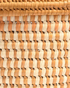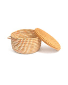 This charming lidded storage basket makes a compact and pleasing place to hide away a multitude of things, such as toys, knitting, cosmetics, toilet roll and even small blankets or scarfs. With its turmeric orange checks against the natural white palm base this circular shaped floor and shelf basket provides a pop of colour in any room.