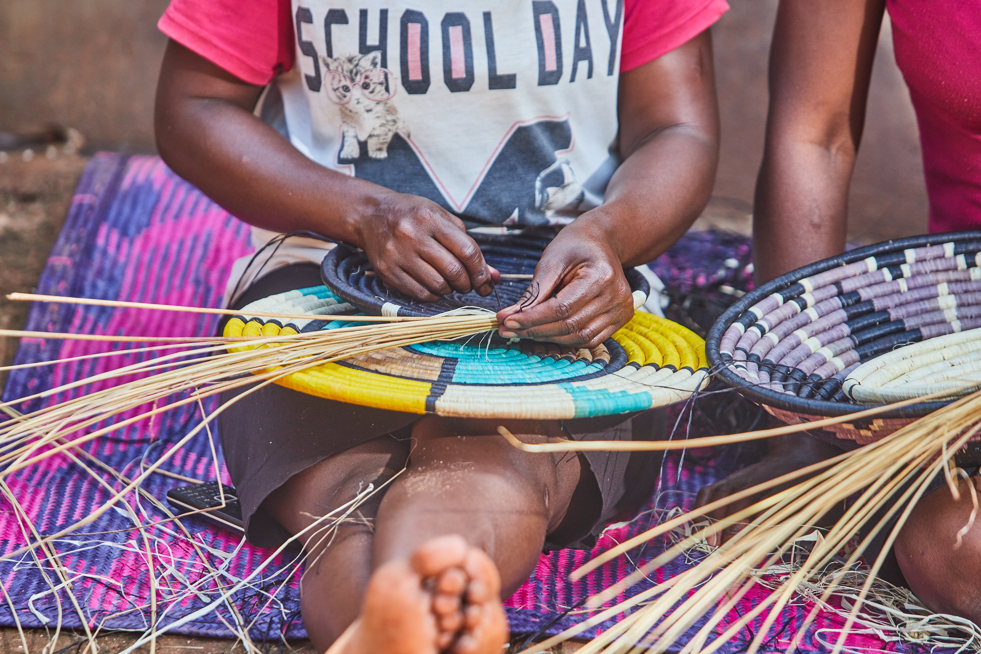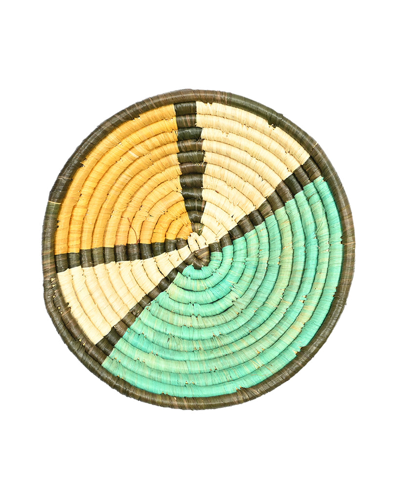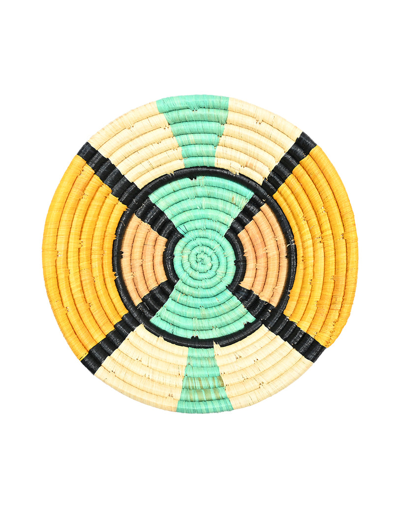 Boasting linear, geometric designs in black, light aqua, peach and mustard yellow, these stylish wall platters are all handcrafted in the Gulu region of Uganda. The weavers in this group are all former child-soldiers and single mothers who have lived through Uganda’s twenty-year war with the LRA. These artisans have been trained in jewellery-making and basket weaving, the latter of which is now their main income stream.