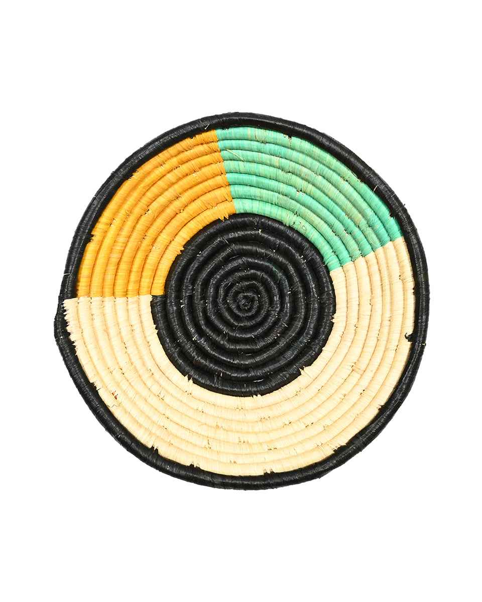 Boasting linear, geometric designs in black, light aqua, peach and mustard yellow, these stylish wall platters are all handcrafted in the Gulu region of Uganda. The weavers in this group are all former child-soldiers and single mothers who have lived through Uganda’s twenty-year war with the LRA. These artisans have been trained in jewellery-making and basket weaving, the latter of which is now their main income stream.