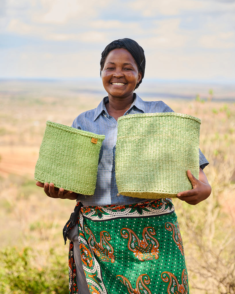 The weavers behind these green storage baskets used to have to make the long journey to Nairobi to sell their work, but The Basket Room now brings them regular weaving work which can be done from the safety and convenience of their own homes. Finished baskets are kept in purpose-built mud huts before being shipped to us in the UK. As global demand for woven homewares ever increases, this wonderful group of artisans continues to grow under the guidance of its bold Chairlady, Madam Dorcas Ndinda.