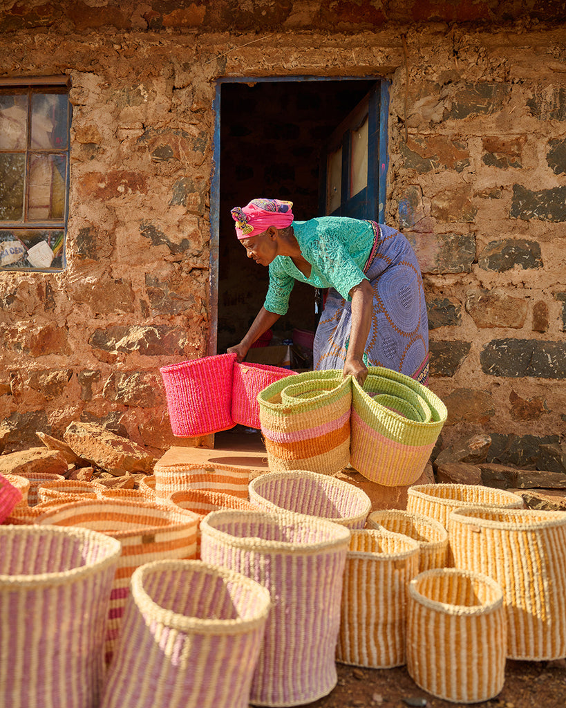 The craftswomen who produce these KIWANDA striped woven baskets all learned to weave sisal from a young age, and practise this traditional African craft within a small collective in rural Kenya. We visit and spend time with this talented group as often as we can, and have fostered a strong bond with the craftswomen and their inspiring chairlady, Madam Dorcas over the years. Before we started trading with this group, the weavers would make the long journey to Nairobi to sell their woven baskets at urban markets. These days, the women can work safely and more efficiently from home, working to complete large and regular orders from The Basket Room.